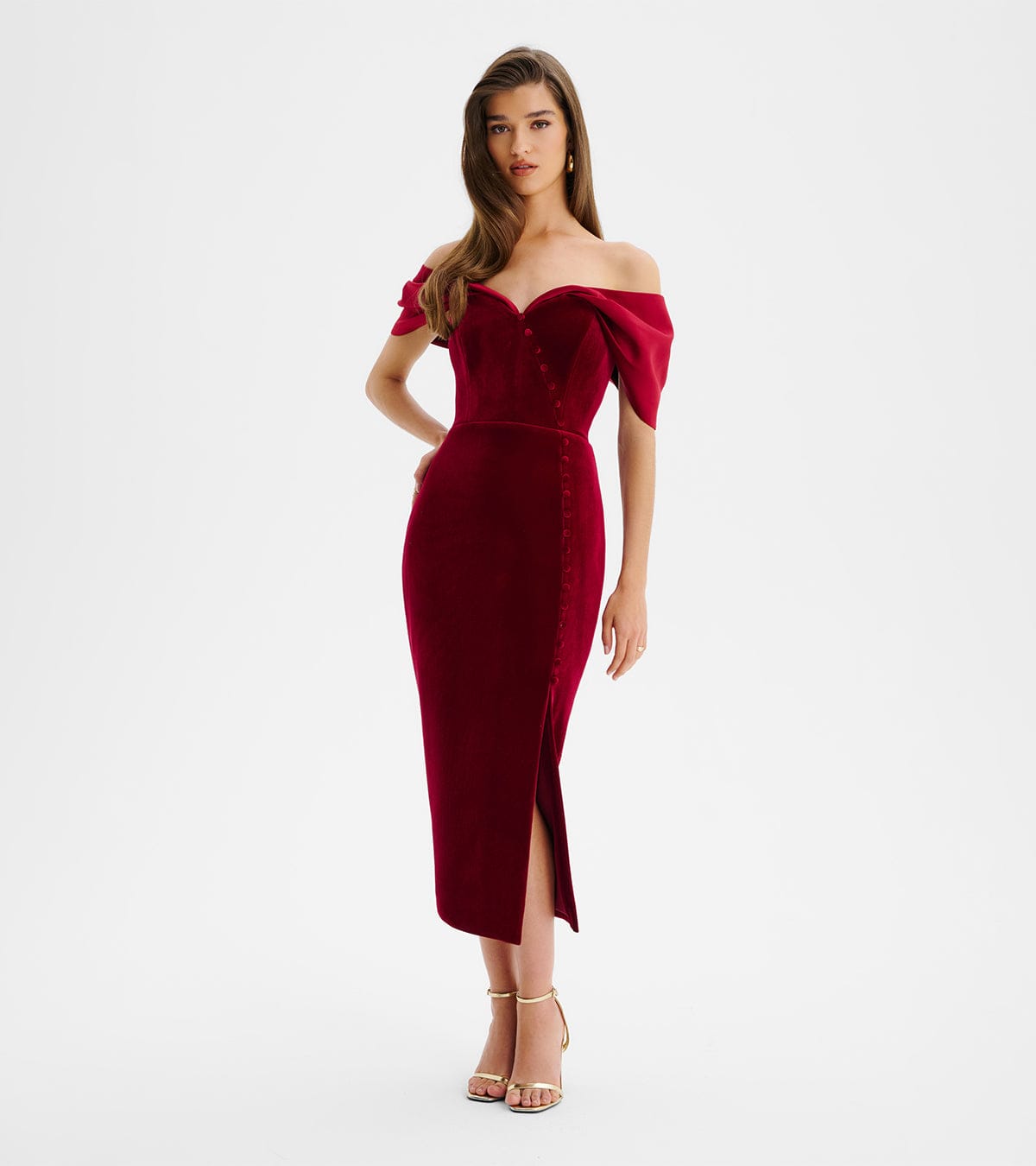 NOELLE Velvet Satin Mix Bardot Midi Dress In BurgundyNOELLE Velvet Satin Mix Bardot Midi Dress In Burgundy