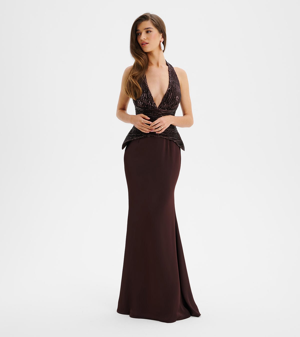 LUCIENNE Pleated Sequin Hourglass Corset Maxi Dress In BrownLUCIENNE Pleated Sequin Hourglass Corset Maxi Dress In Brown