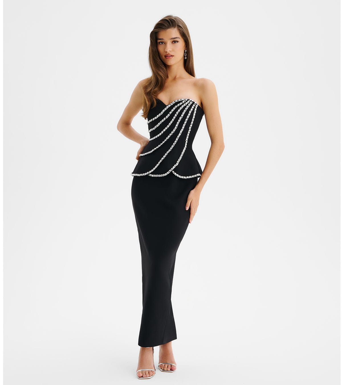 VALENTINA High Neck Crystal Embellished Peplum Maxi Dress In BlackVALENTINA High Neck Crystal Embellished Peplum Maxi Dress In Black