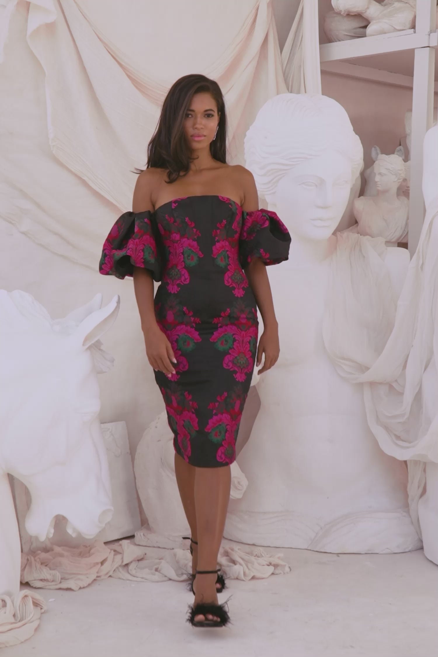This CAPRI Jacquard Volume Sleeve Bardot Midi Dress in Black is the perfect style for any evening occasion. Featuring a luxurious jacquard fabric, puff sleeve detailing and a bardot neckline, this dress is both stylish and sophisticated. Elevate your look with ease with this beautiful statement piece.