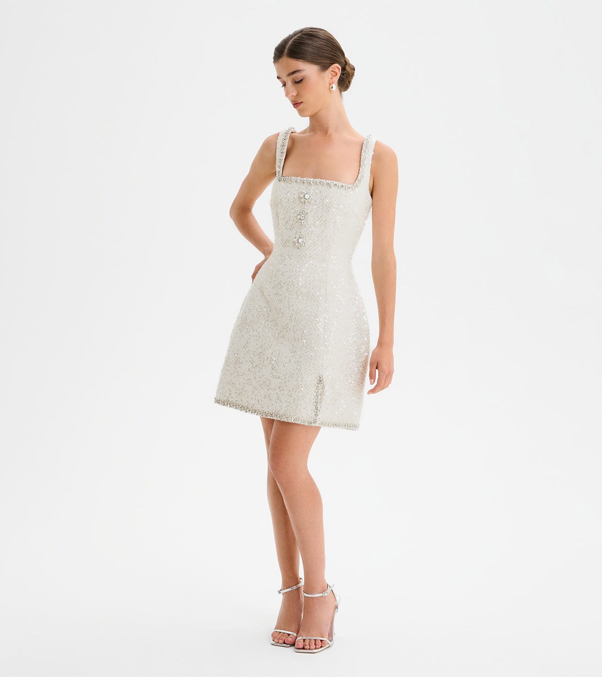 CARA Micro Button and Loop Detail Volume Flared Mini Dress in Floral Broderie Sale price$120.00 Regular price$404.00