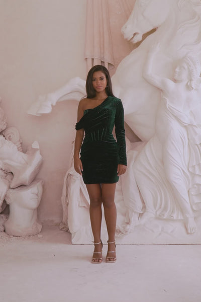 EOS Glitter Velvet One Shoulder Drape Mini Dress in Emerald Green