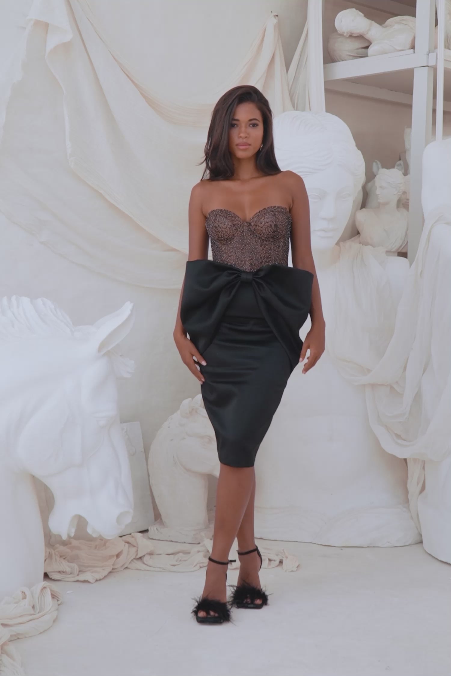 ALEXANDRIA Extreme Bow Corset Detail Satin Midi Dress in Black