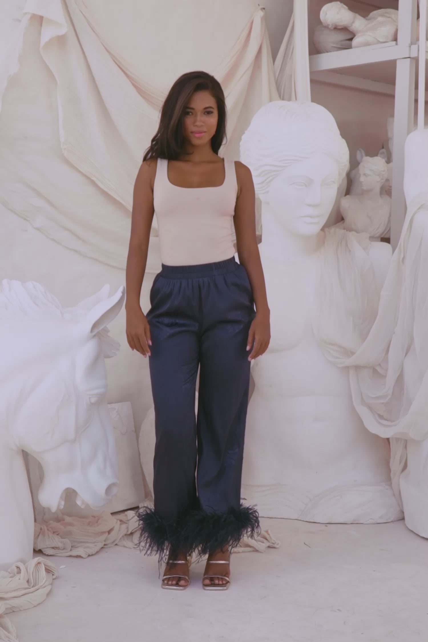 HELEN Feather Trim Satin Jacquard Pyjama In Navy