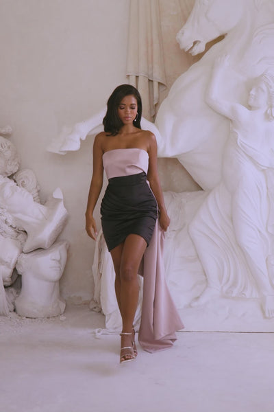 OLYMPIA Extreme Drape Bandeau Satin Mini Dress in Black & Champagne Sale price$144.00 Regular price$356.00