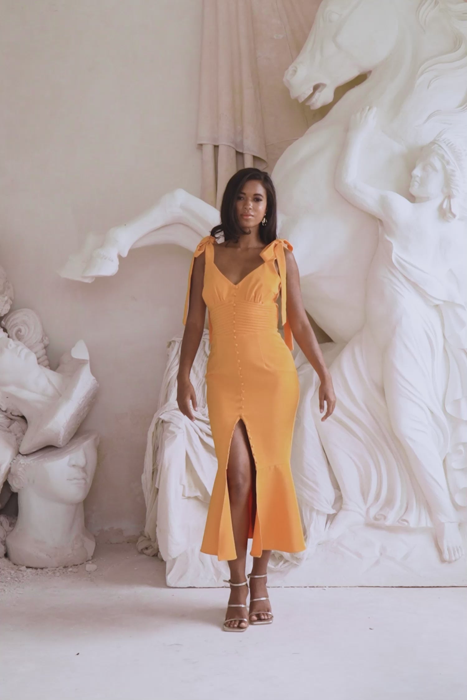 Leave them mesmerised in this delicate and romantic piece, dainty buttons meet in the centre of your figure to skim each curve effortlessly. Statement bows fall on each shoulder in vibrant tangerine to create the must have piece for any upcoming occasion. Wear your hair in a soft up-do and let KAMILA do the talking.